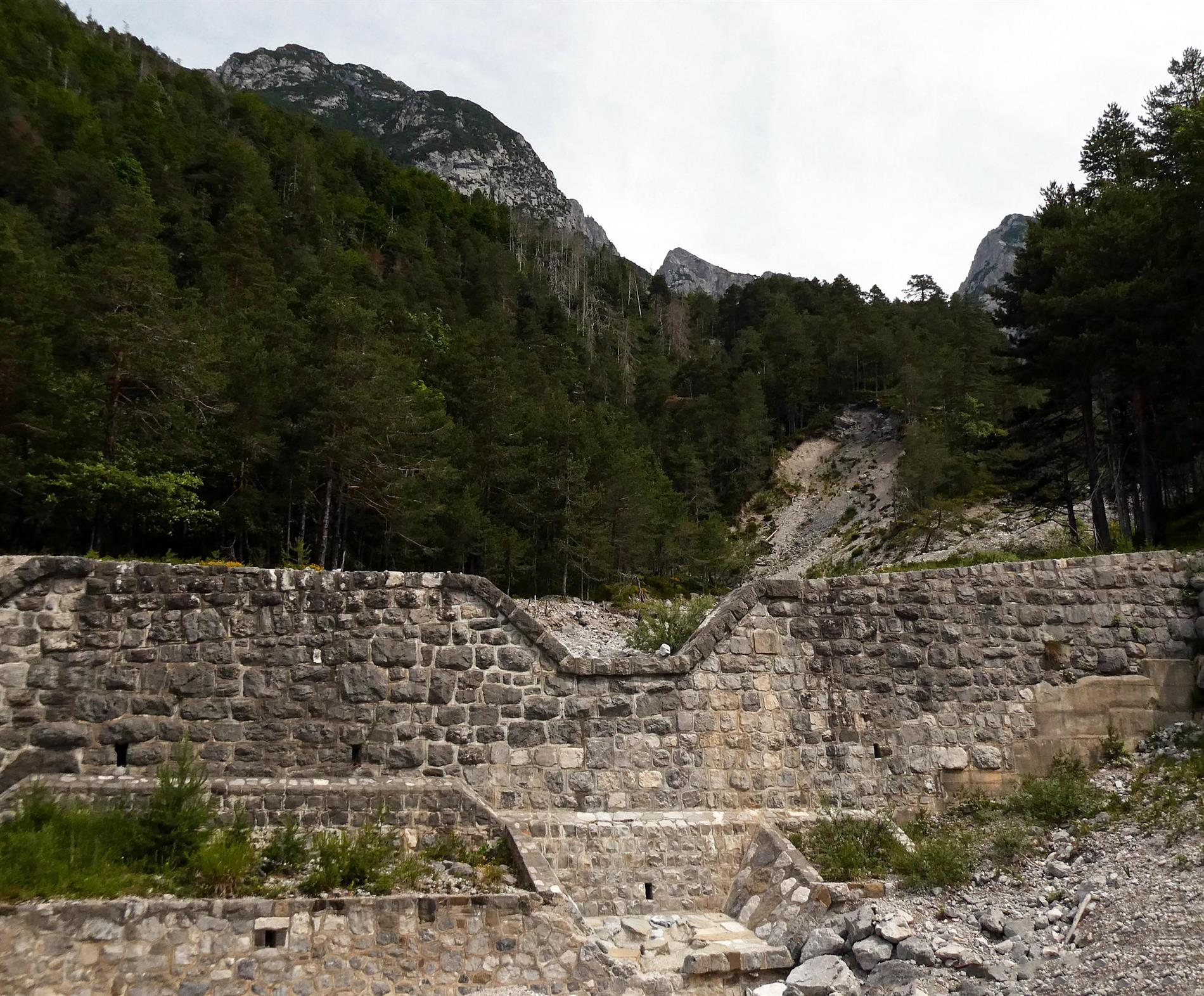 L'immagine prodotta del 1956 mostra come la struttura preesistente alla briglia fosse caratterizzata da una volta in cemento e da un vano a essa sottostante; si può pertanto ipotizzare che sostanziasse una fortificazione protettiva (come una caverna blindata per riservetta munizioni), un ponte oppure un'opera di carattere idraulico costruita a protezione della rotabile militare. Nel 1997, tale volta appariva murata e quindi integrata in una briglia di irregimentazione del Rio Cjanalòt.