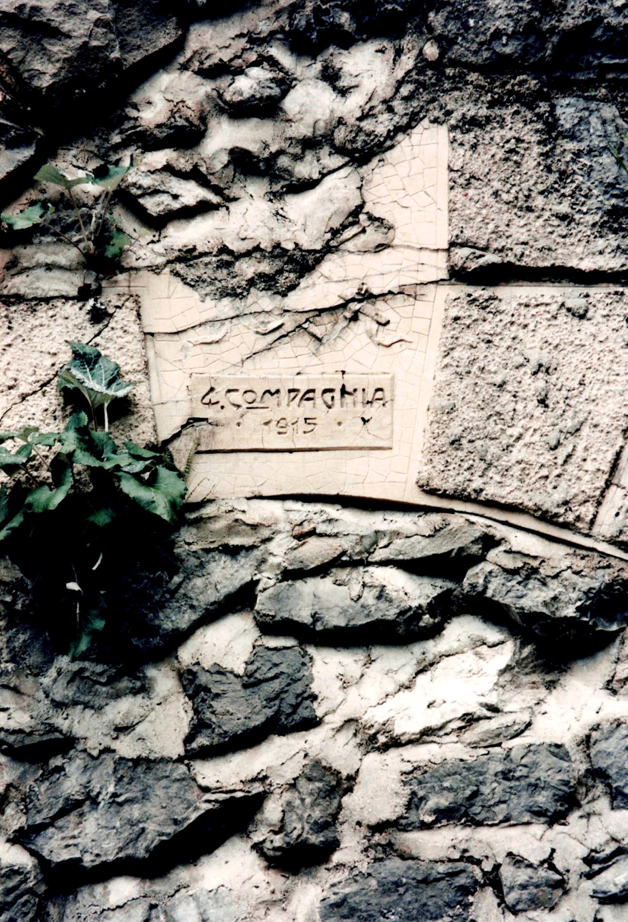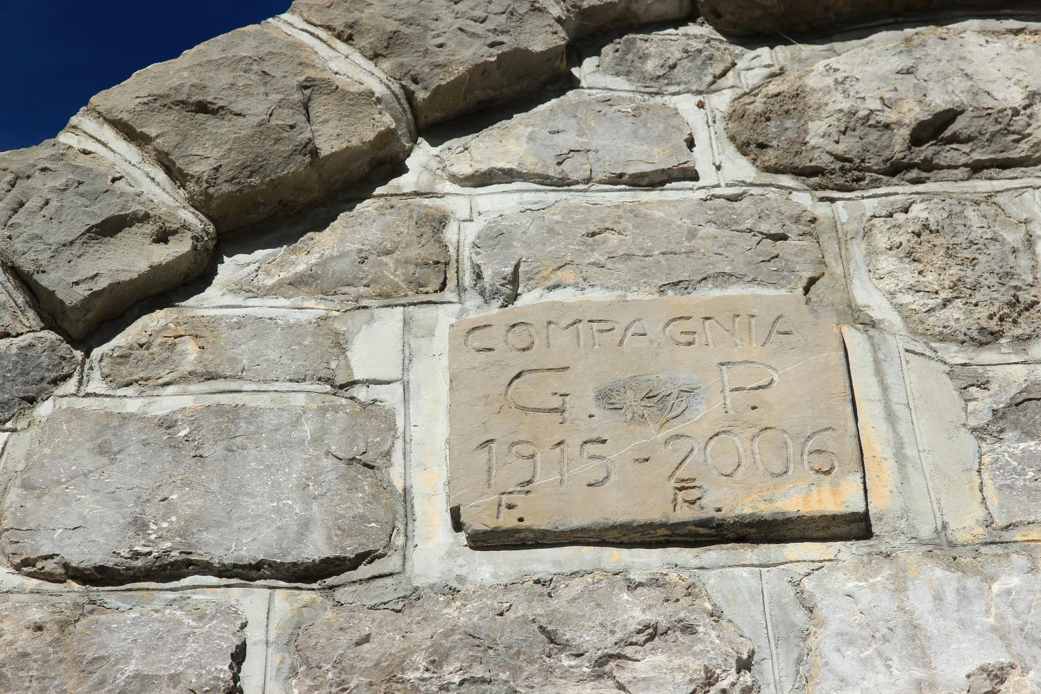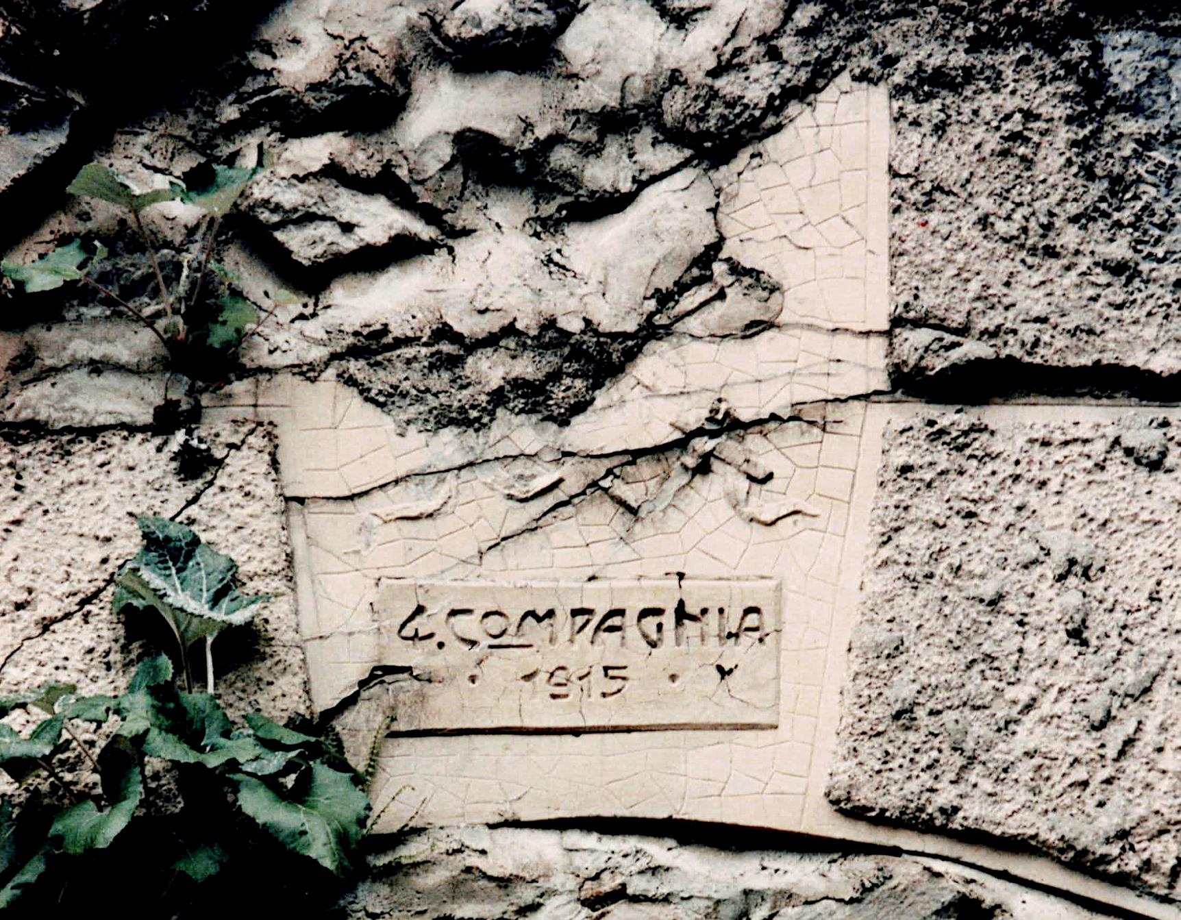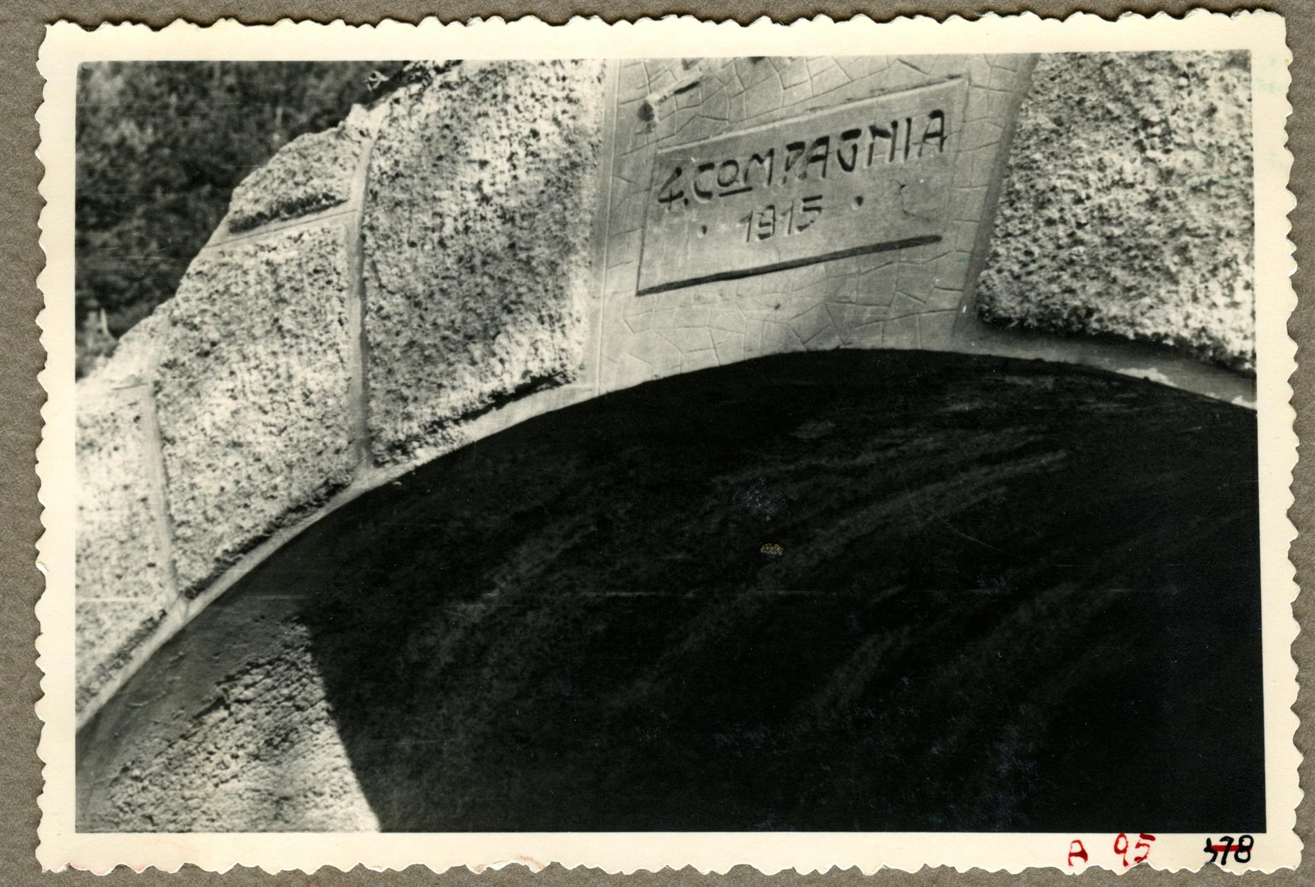 La targa originaria menzionava la 4ª Compagnia del 5° Reggimento Genio Minatori, compagine specializzata nei lavori di mina e nell'impiego di esplosivi (anche in funzione di sbancamento e costruzione di opere viarie e fortificate, come gallerie stradali e caverne cannoniere), che nel 1915 risultava assegnata al XII Corpo d'Armata Zona Carnia e che in Val Dogna ha lasciato numerose altre testimonianze epigrafiche.