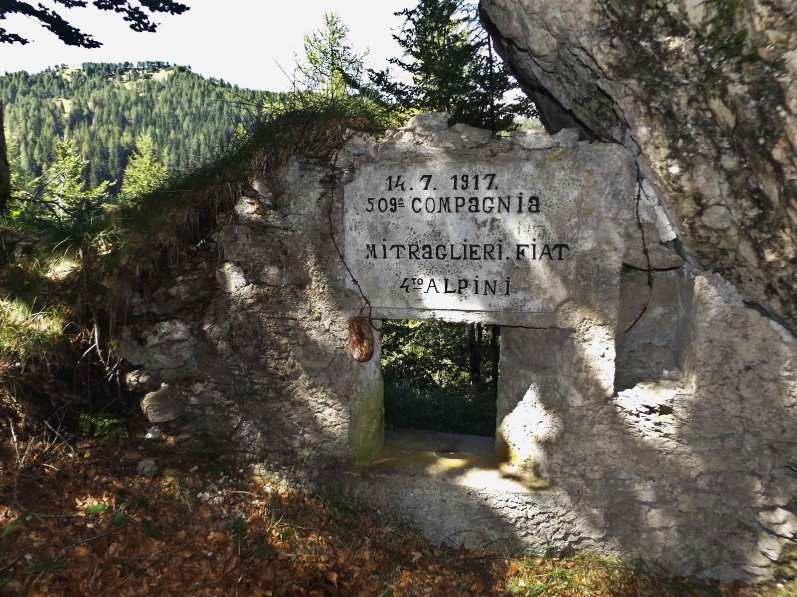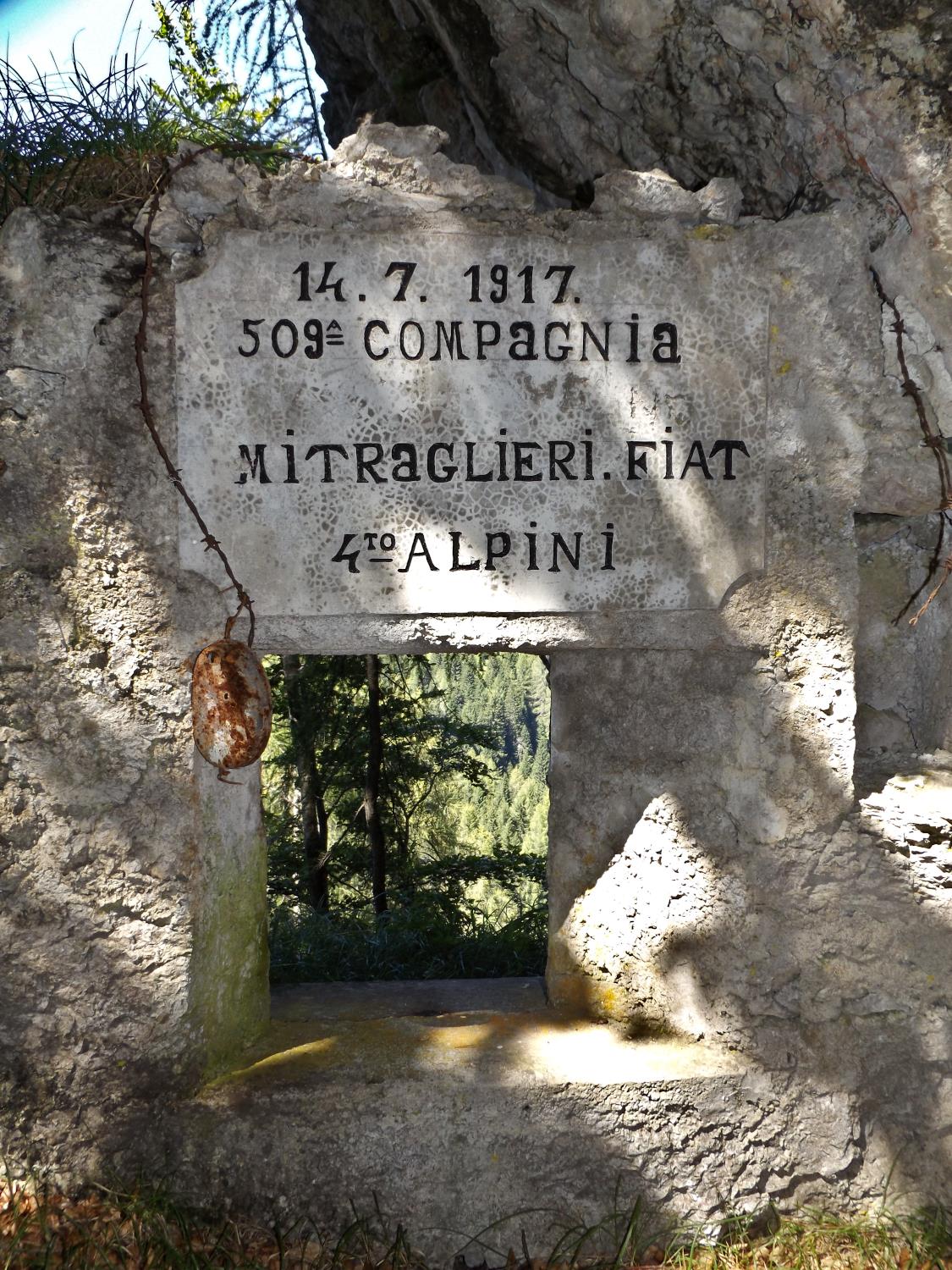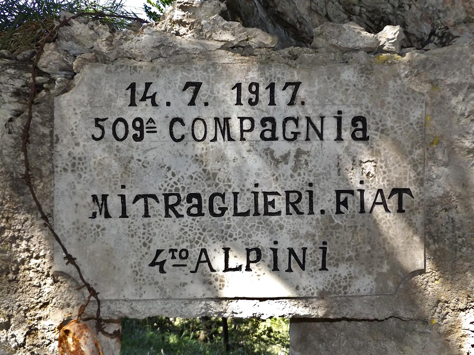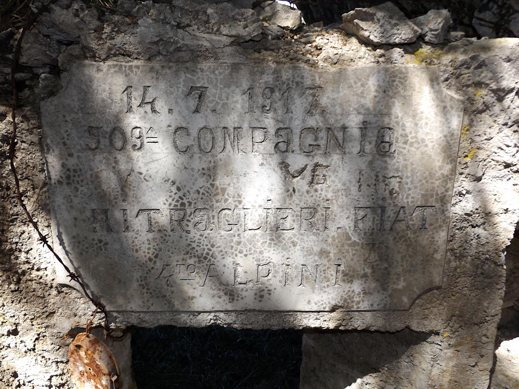 Targa della 509ª Compagnia Mitragliatrici Fiat (reparto costituito dal Deposito del 4° Reggimento Alpini), posta il 14 luglio 1917 presso una postazione della linea di capisaldi per mitragliatrici che, dal costone fra il Clap del Jovèl e Sella Bieliga, supportavano le antistanti posizioni avanzate allestite dalle forze italiane sugli alti versanti che digradano verso la Val Canale.