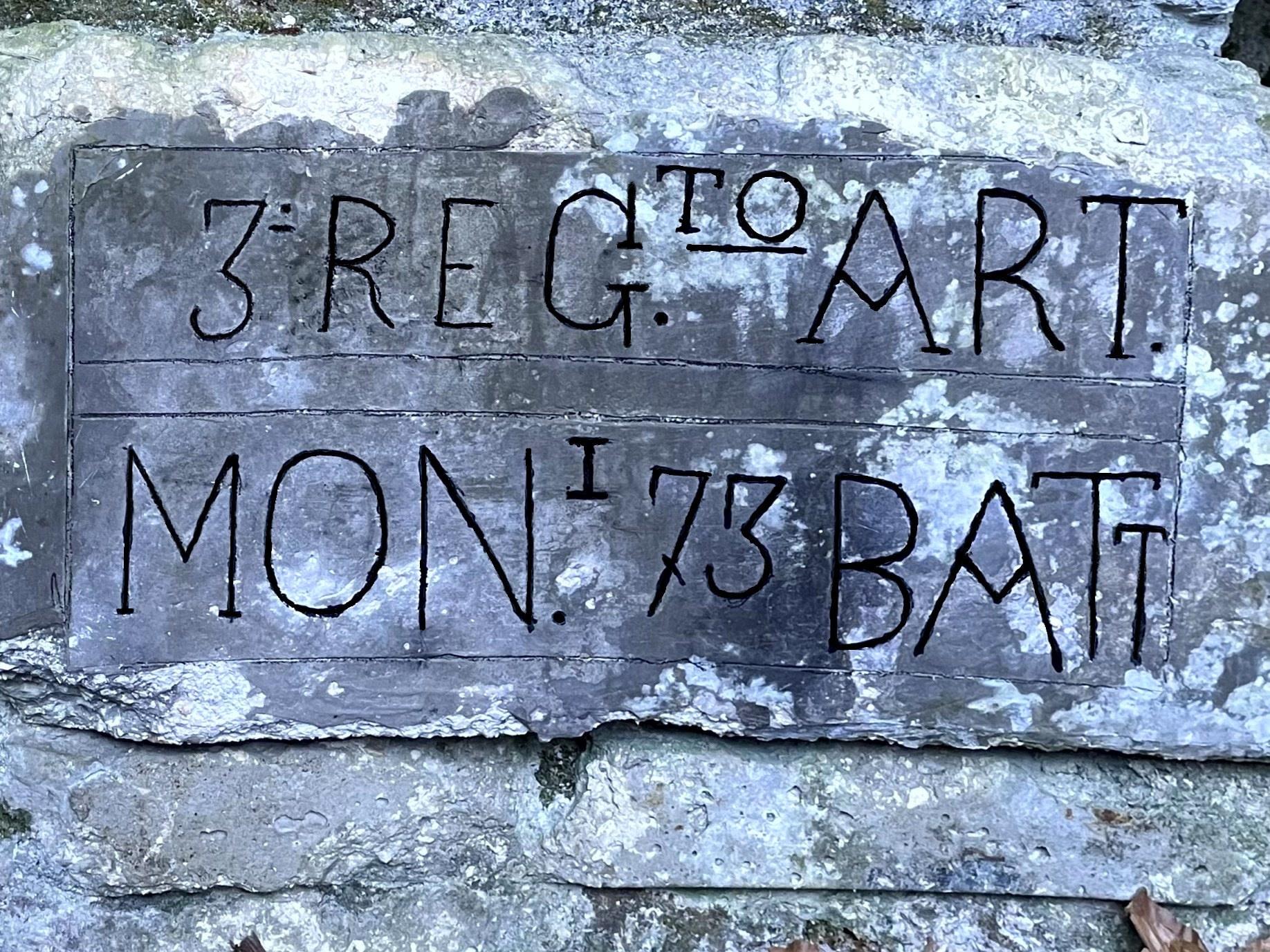 La postazione con la targa della 73ª Batteria è molto particolare, presentando al suo interno, nella parte posteriore, un muro rinforzato di cemento con andamento semicircolare, al fine di agevolare le manovre di rotazione del pezzo lì ubicato; il profilo del muro ha infatti due incavi paralleli, che verosimilmente potevano essere le nicchie per i binari dei meccanismi di rotazione del cannone. Sempre sul muro semicircolare, dove è collocata la targa della 73ª Batteria, sono presenti due aperture, occluse da materiale crollato: quella a sinistra della targa conduceva ai camminamenti retrostanti alla postazione, riparati dal dosso della postazione stessa e costituiva l'ingresso originario; l'apertura a destra della targa immetteva in un locale, anch'esso crollato, adibito probabilmente a deposito o riparo. La finestra di sparo è completamente crollata; al suo ingresso sono presenti grossi blocchi di macerie, cemento e pezzi di ferro che costituivano i rinforzi della postazione.