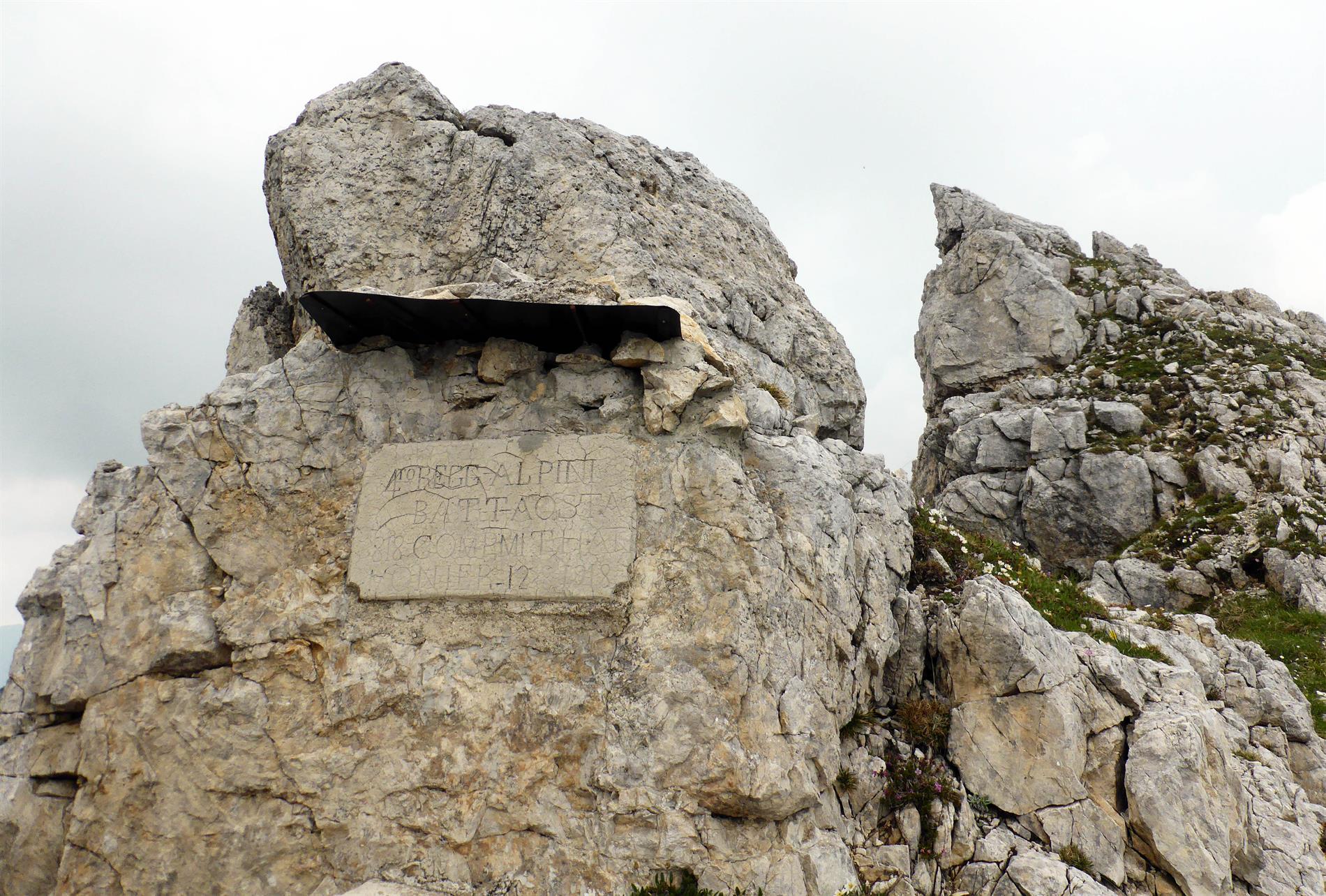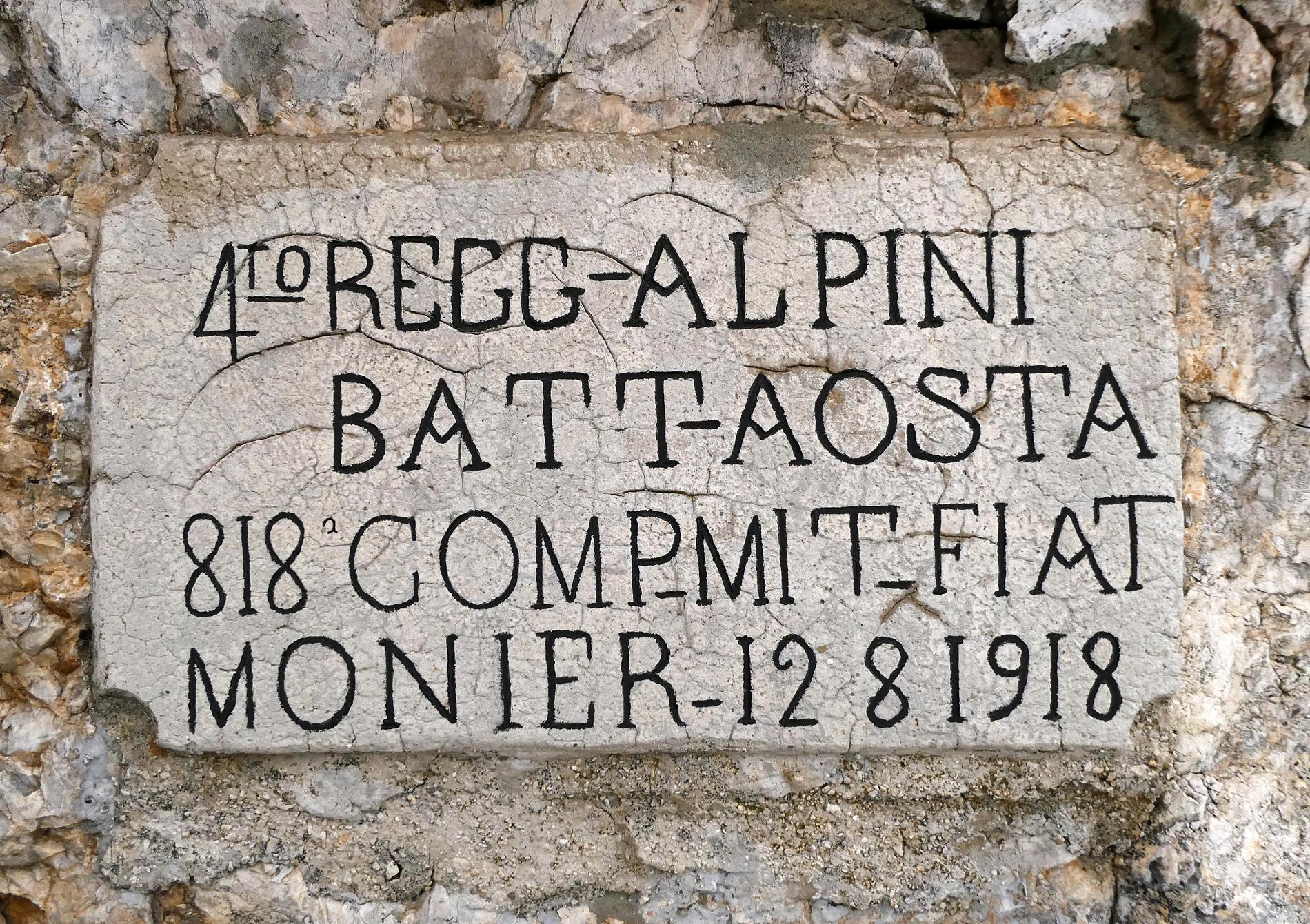 L'epigrafe in oggetto testimonia la presenza dell'818ª Compagnia Mitragliatrici, assegnata al Battaglione Alpini Aosta, sulla cresta del Monte Forni Alti nell'agosto 1918.