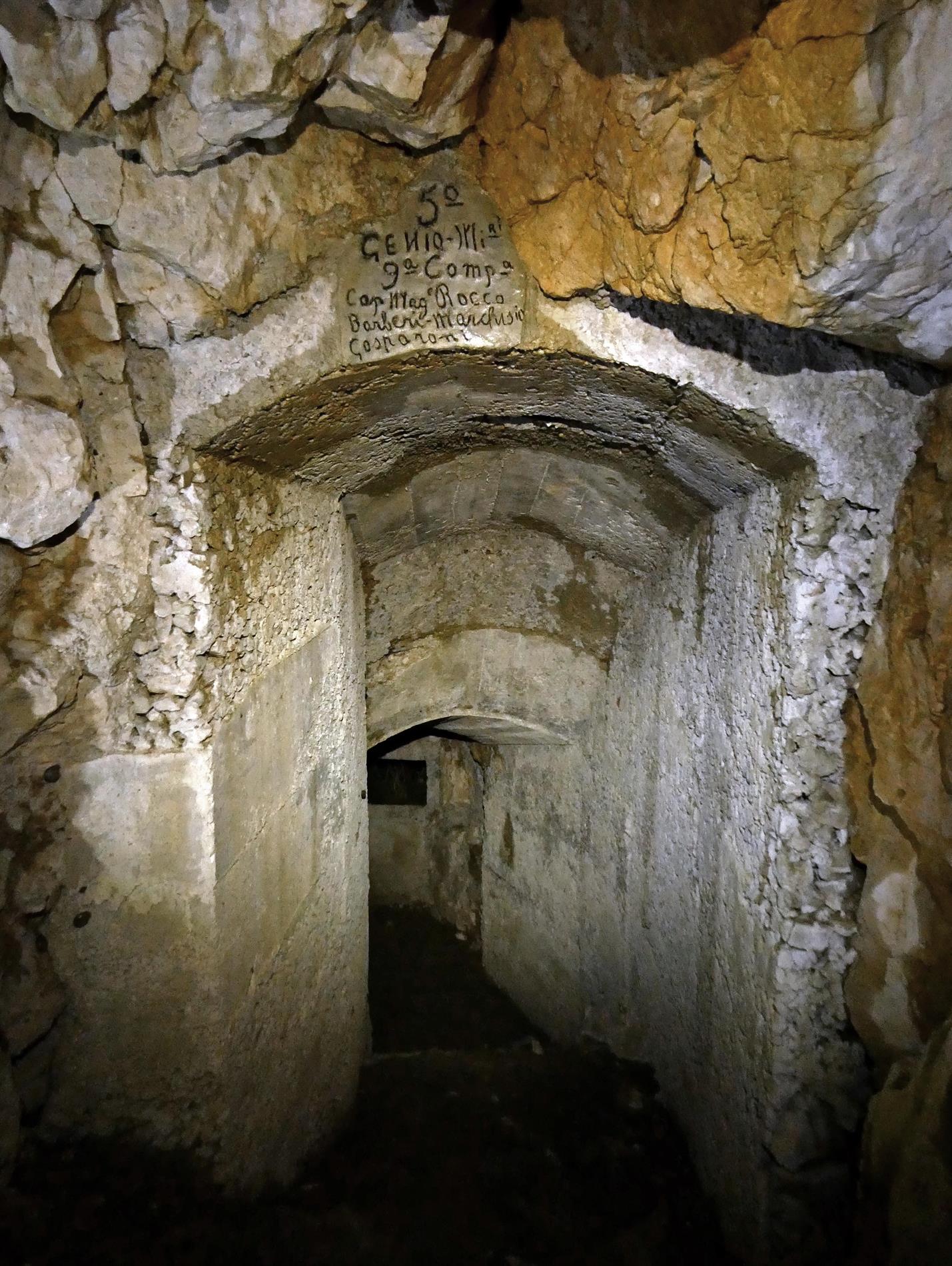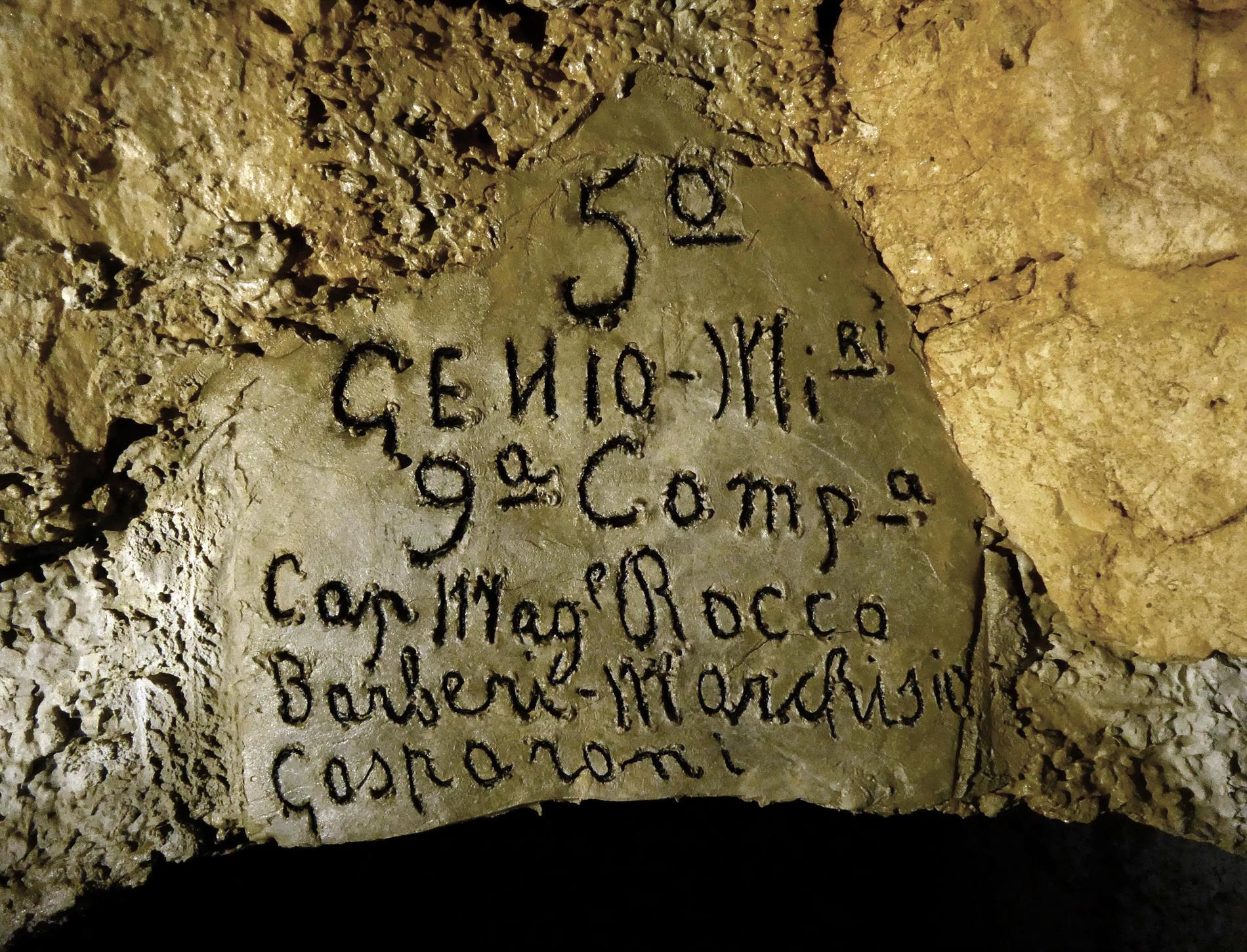L'iscrizione in oggetto (così come quelle catalogate nelle schede codd. 003824 e 003825) si rinviene all'interno di una postazione per mitragliatrice ricavata in un roccione lungo la rotabile che collega il Novegno con il paese di Santa Caterina di Tretto e testimonia (in uno con le epigrafi rinvenibili sul Monte Vaccaresse; cfr. schede codd. 002968, 003218, 003589, 003590, 003591, 003592, 003594, 003595, 003596, 003821, 003822, 003844, 003845 e 003846) il contributo dato dal 5° Reggimento Genio Minatori, con la sua 9ª Compagnia e la 679ª Centuria Lavoratori (al comando del Caporal Maggiore D. Rocco), alla realizzazione e mantenimento di tali strutture nel periodo tra settembre e dicembre 1917.