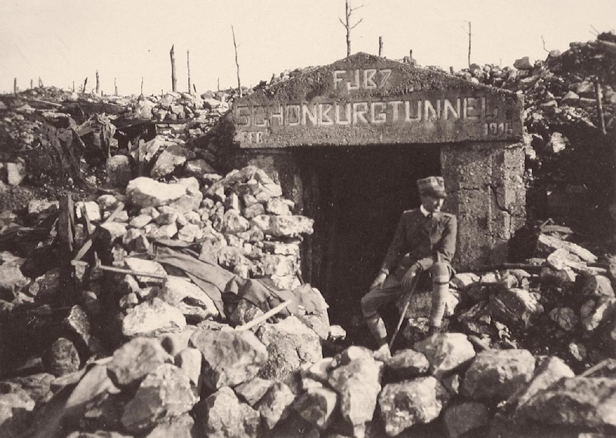 a. Un ufficiale italiano posa dinnanzi allo Schönburgtunnel, dopo la conquista del San Michele dell'agosto 1916 (Fonte: Archivio Museo della Grande Guerra di Ragogna)