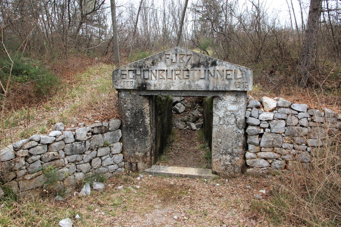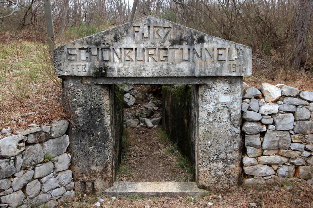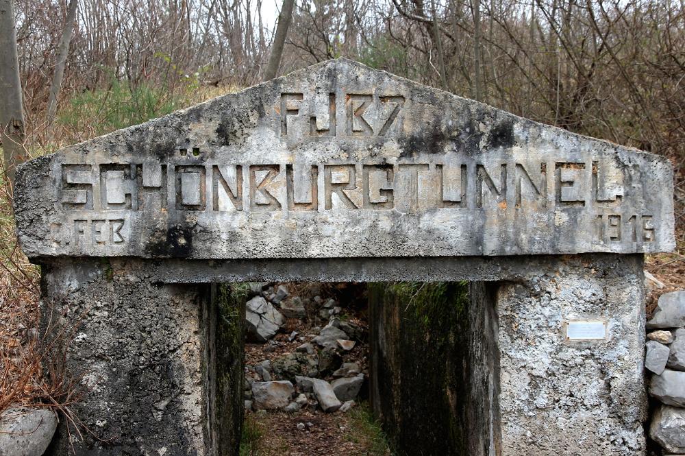Lo Schönburgtunnel, verosimilmente costruito nell'autunno-inverno fra il 1915 e il 1916 e ultimato nel febbraio 1916 (come ricorda l'epigrafe), fu una delle lunghe gallerie passanti edificate dagli Austro-Ungarici per porre in comunicazione sotterranea (e quindi protetta) i ricoveri posti sui declivi orientali e nelle conche fra le cime del Monte San Michele con le postazioni difensive scavate sulla dorsale e sui pendii che guardavano le provenienze occidentali (da dove giungevano gli attacchi italiani). Si rivelò quindi un'opera determinante ai fini della difesa imperiale del Monte San Michele, soprattutto per quanto concerneva i movimenti di afflusso dei rincalzi verso le postazioni di resistenza.