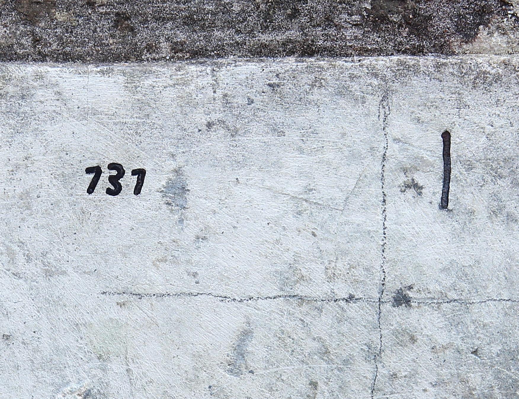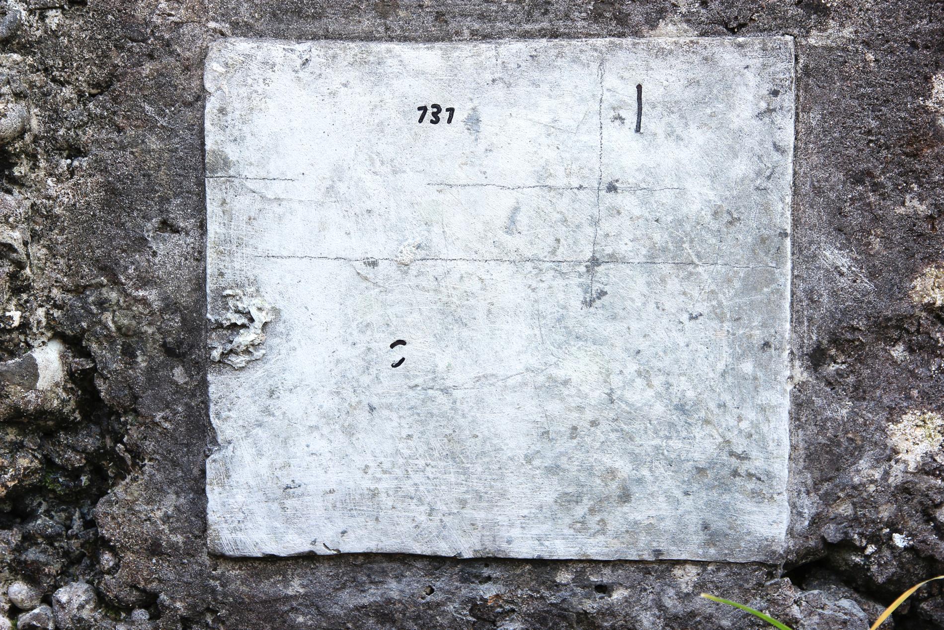 Lo specchio della targa presente un'unica assai piccola incisione avente ad oggetto il numero 131, affiancato da alcuni tratti non inequivocabilmente decifrabili. Osservando l'elemento epigrafico, appare verosimile che il minuto graffito del "131" non rappresentasse il contenuto per cui originariamente si era predisposto il ben più ampio supporto costituito dalla targa,