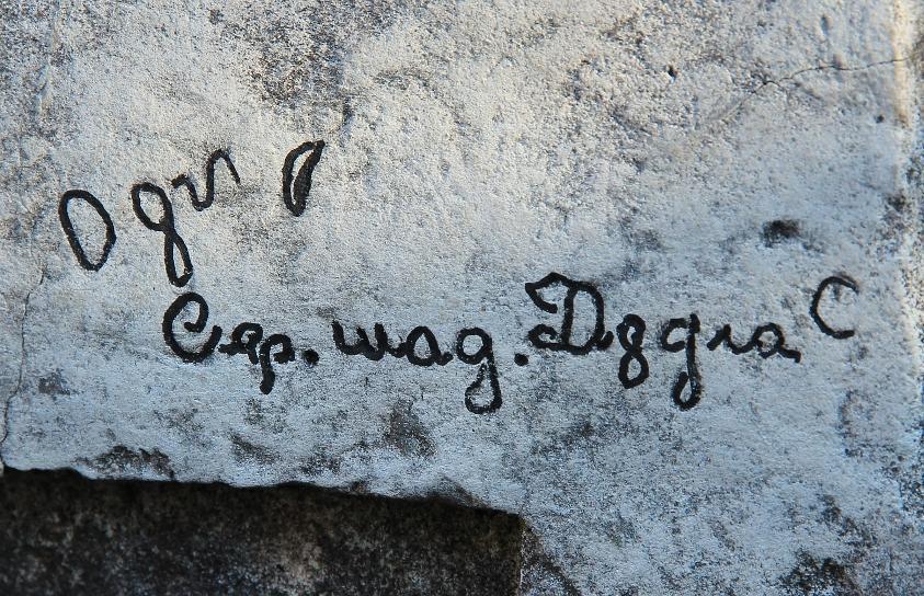 L'epigrafe, analogamente ad altre iscrizioni dei reparti di Cavalleria, appare volontariamente danneggiata e/o in parte cancellata in tempi remoti, non è noto se ancora nel periodo della Grande Guerra o durante la Seconda Guerra Mondiale o in epoche immediatamente successive.
