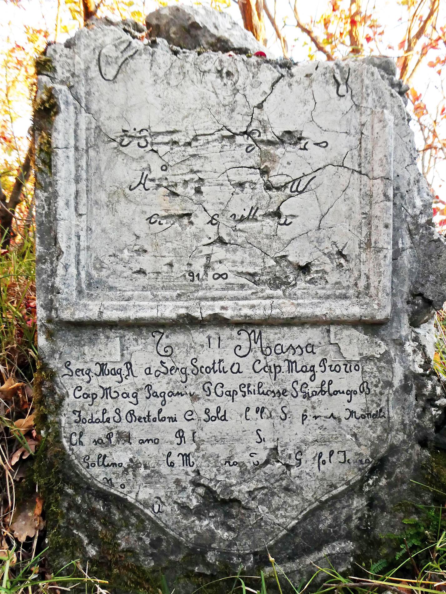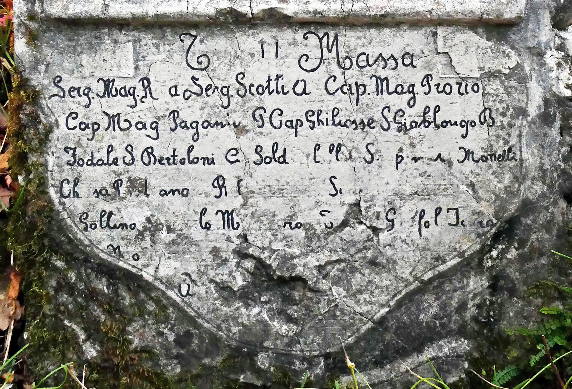 Oggetto epigrafico composto da due targhe lasciata da militari del Regio Esercito, che presentano rispettivamente i resti di un fregio con un'iscrizione illeggibile e una serie di nominativi di militari, in gran parte non decifrabili.