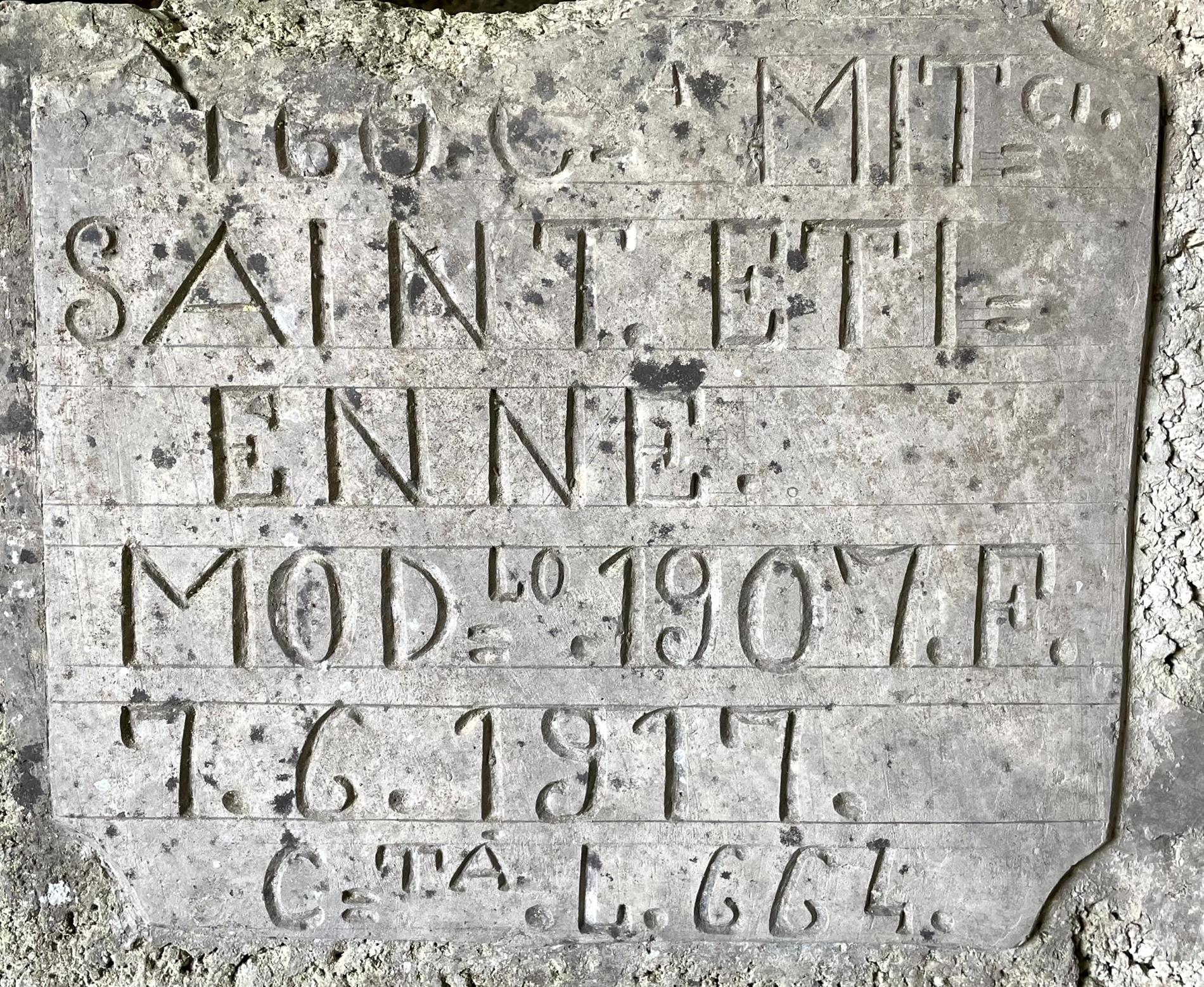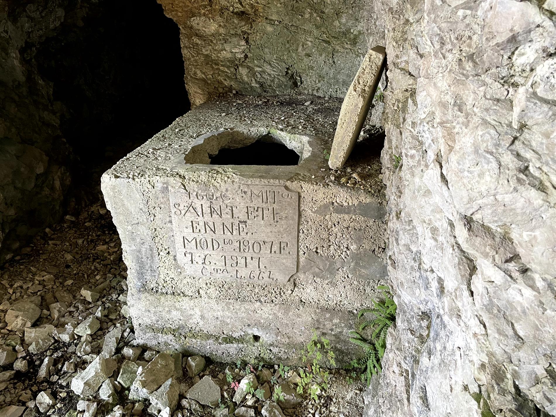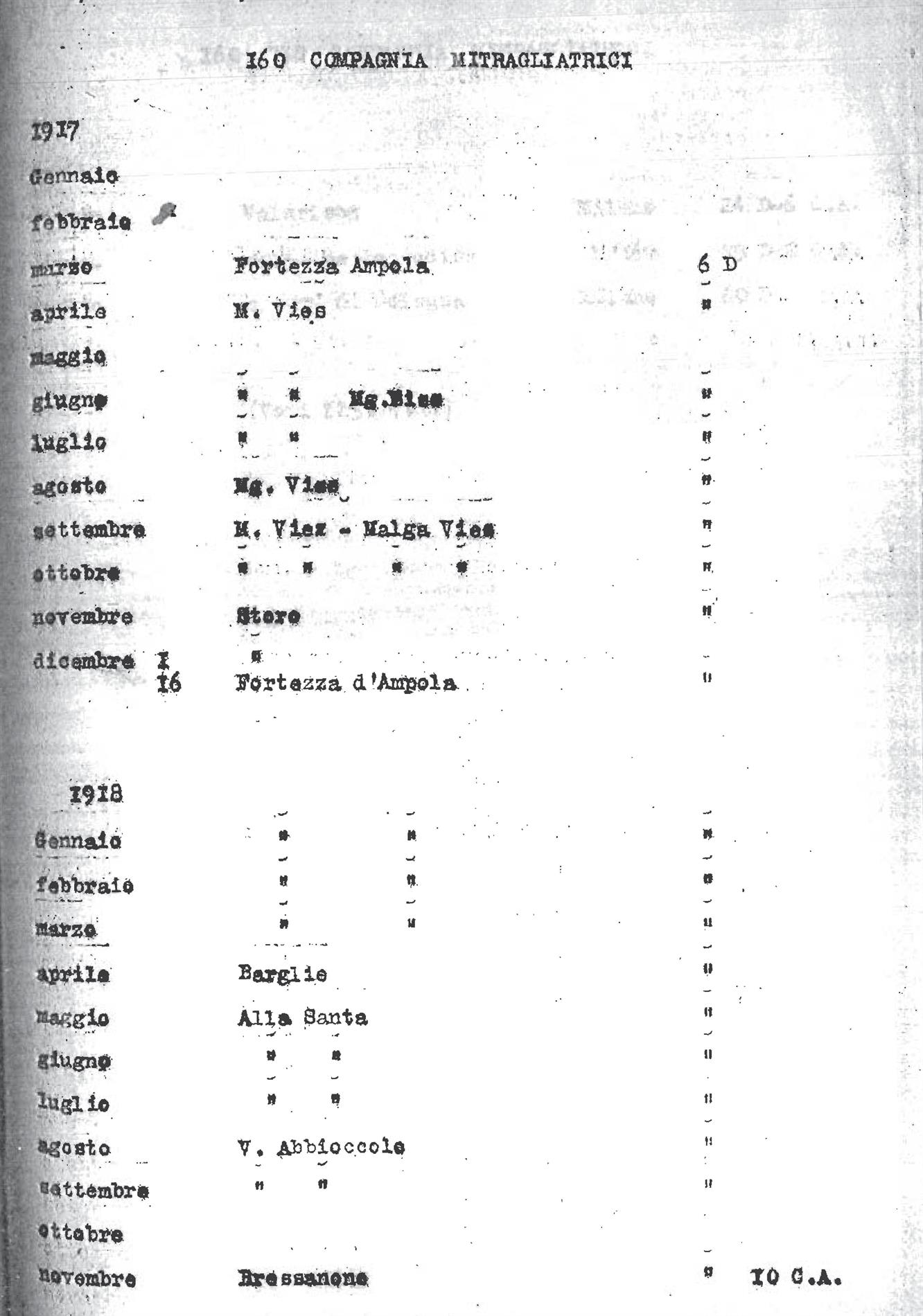 La targa in oggetto si trova sulla parete di una vasca per l'acqua, all'interno di un deposito sul monte Vies e testimonia la presenza della 160ª Compagnia Mitragliatrici (modello Saint Etienne 1907 Fiat) che realizzò quel manufatto nei primi giorni del Giugno 1917.