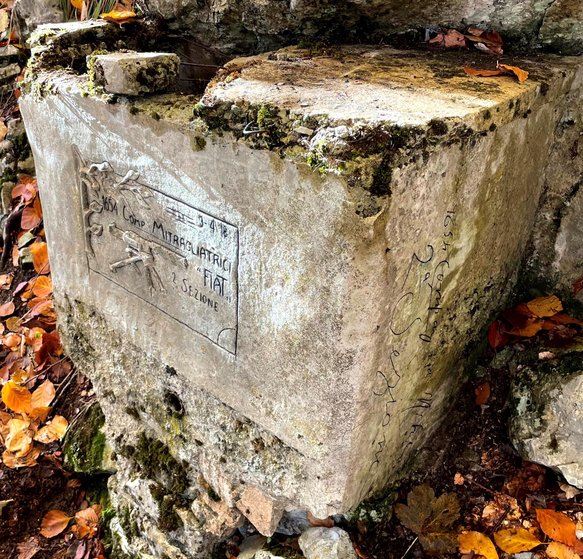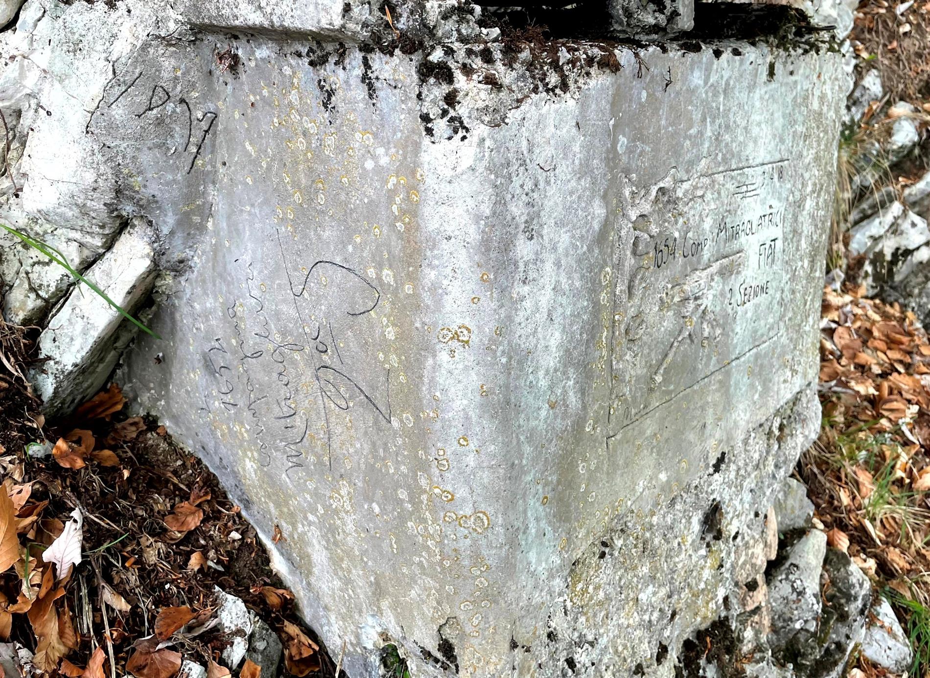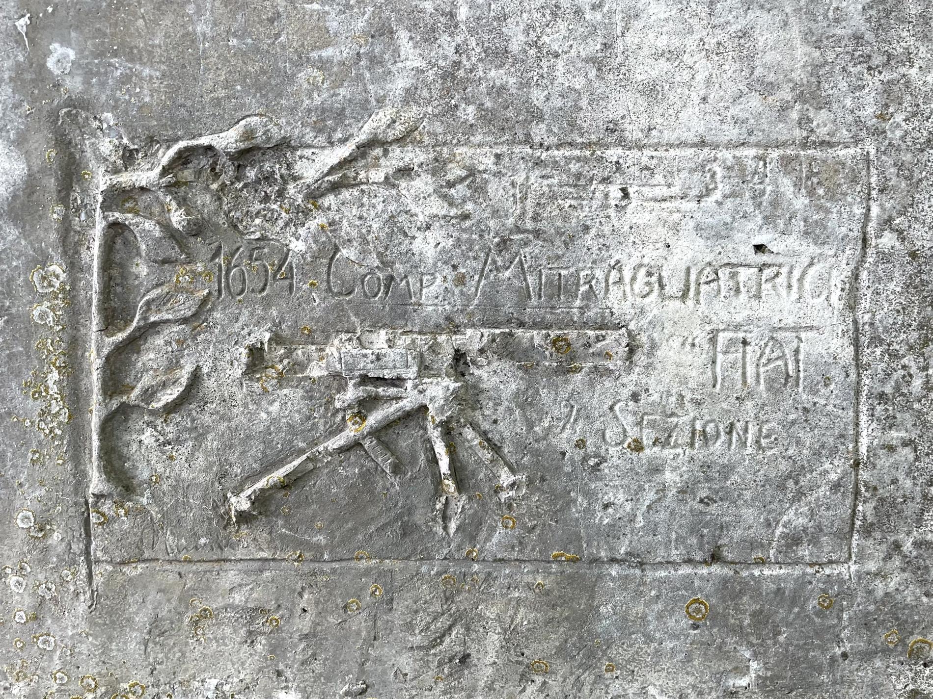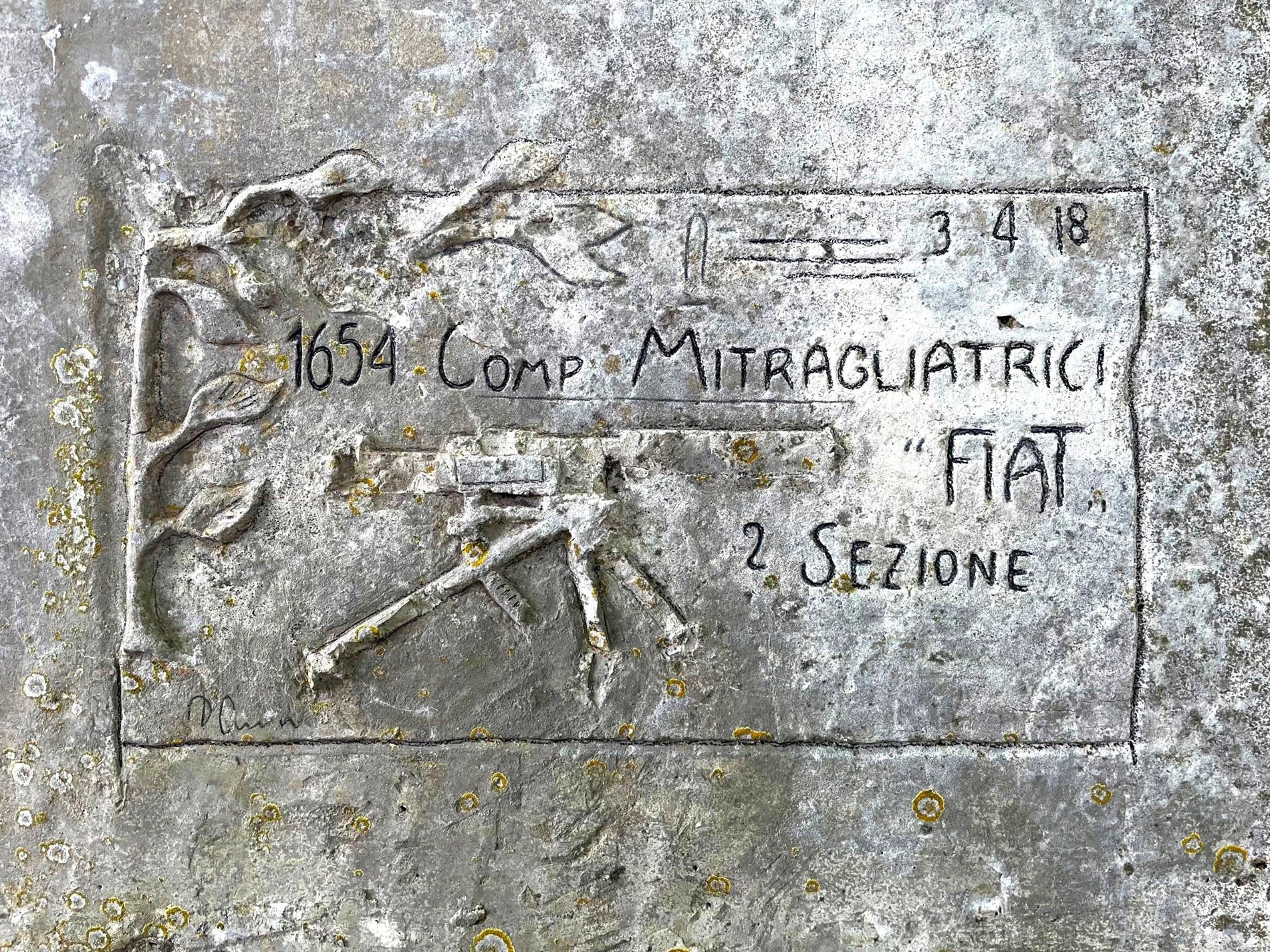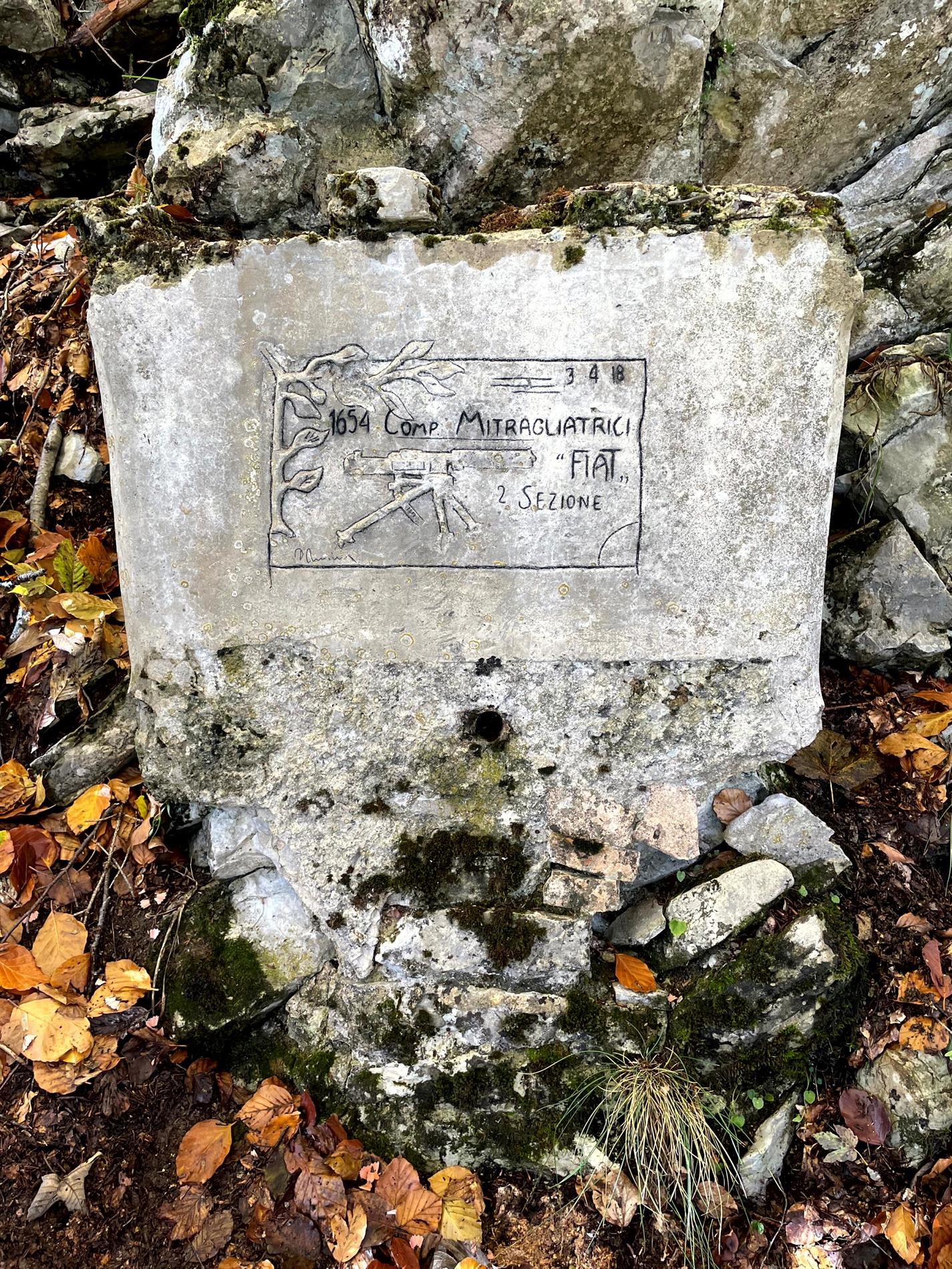 La pregevole epigrafe in oggetto adorna una vaschetta per l'acqua e testimonia la presenza della 1654ª Compagnia Mitragliatrici sul monte Cingla; sul manufatto sono presenti iscrizioni della medesima Compagnia anche sui fianchi destro e sinistro.