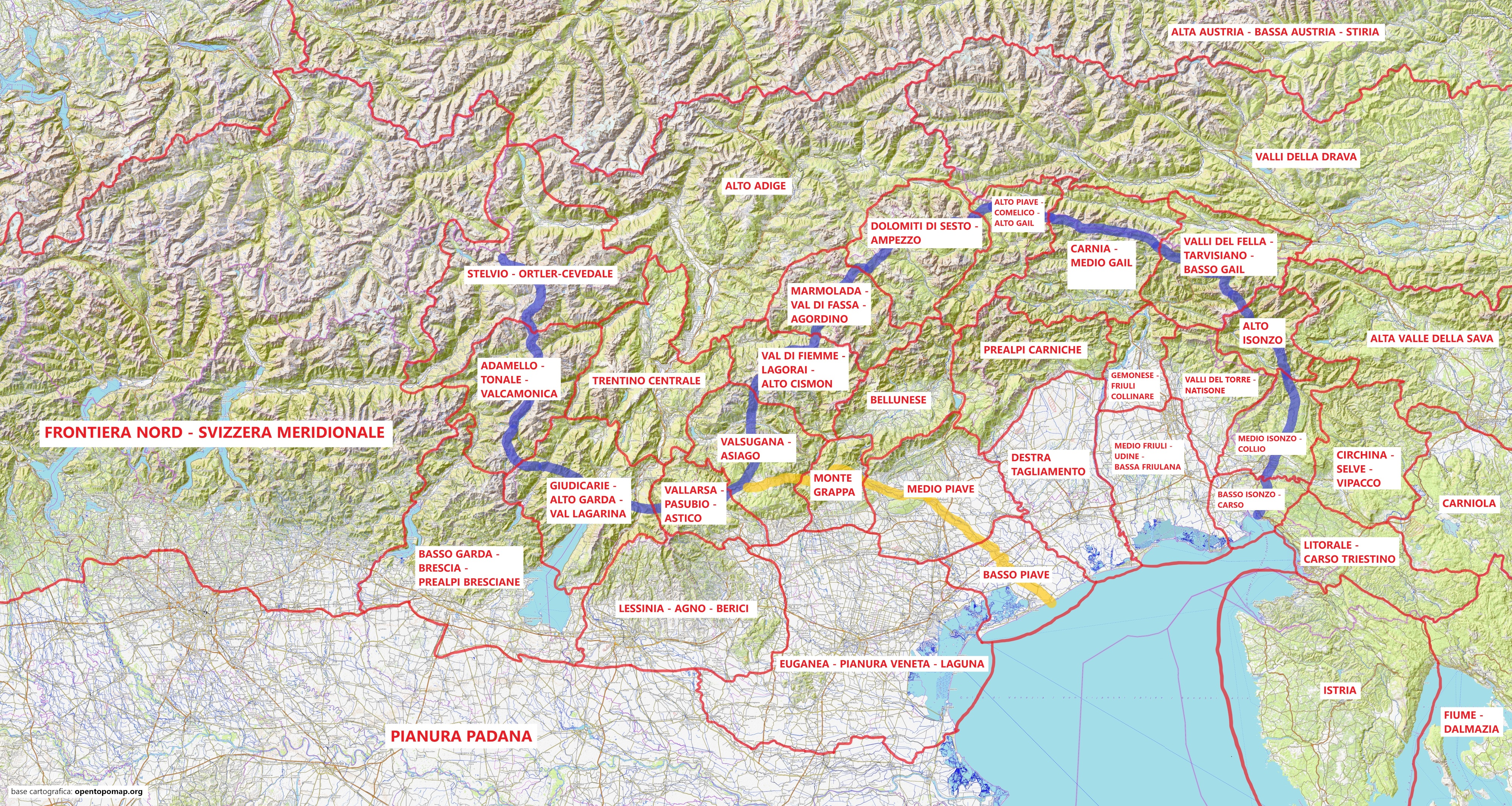I settori sono i seguenti: Stelvio - Ortler-Cevedale; Adamello - Tonale - Valcamonica; Alto Adige; Trentino Centrale; Giudicarie - Alto Garda - Vallagarina; Basso Garda - Brescia - Prealpi Bresciane; Lessinia - Agno - Berici; Vallarsa - Pasubio - Astico; Valsugana - Asiago; Val di Fiemme - Lagorai - Alto Cismon; Marmolada - Val di Fassa - Agordino; Dolomiti di Sesto - Dolomiti d’Ampezzo; Bellunese; Prealpi Carniche; Alto Piave - Comelico - Alto Gail; Carnia - Medio Gail; Valli del Fella - Tarvisiano - Basso Gail; Valli della Drava; Alta Valle della Sava; Alto Isonzo; Valli del Torre - Natisone; Medio Isonzo - Collio; Basso Isonzo - Carso; Circhina - Selve - Vipacco; Litorale - Carso triestino; Carniola; Istria; Fiume - Dalmazia; Gemonese - Friuli Collinare; Medio Friuli - Udine - Bassa Friulana; Destra Tagliamento; Monte Grappa; Medio Piave; Basso Piave; Euganea - Pianura Veneta - Laguna; Pianura Padana - Astigiano; Frontiera Nord - Svizzera Meridionale; Alpi Occidentali - Alpi Marittime - Liguria; Centro Italia - Italia Meridionale - Isole; Alta Austria - Bassa Austria - Stiria.